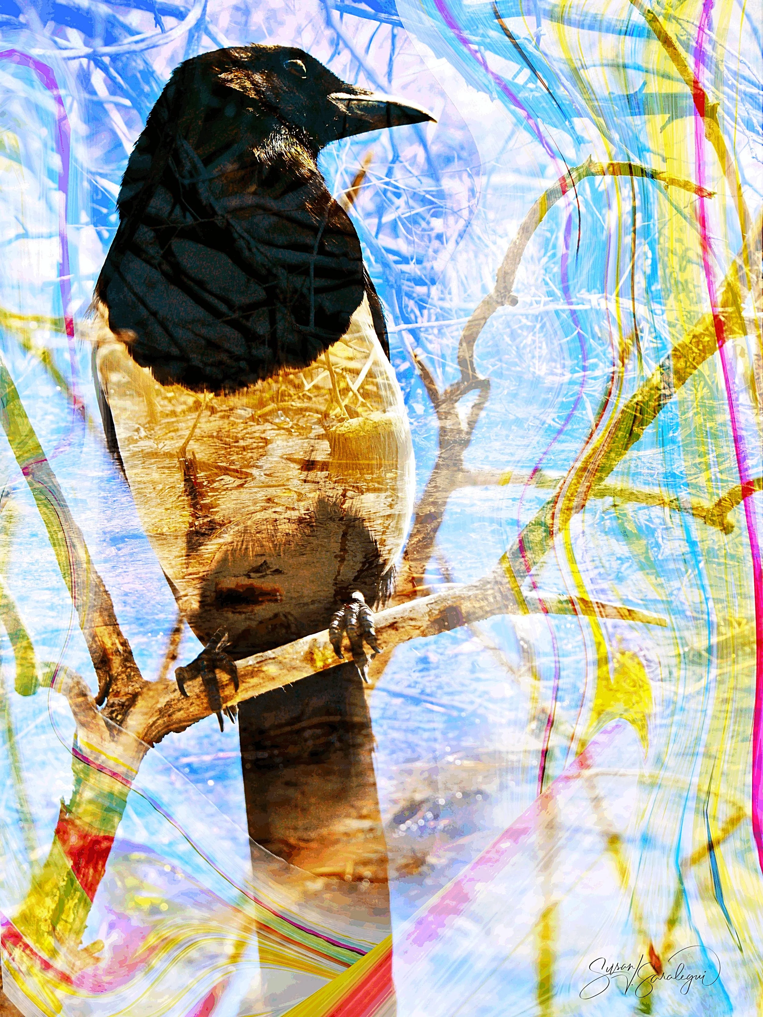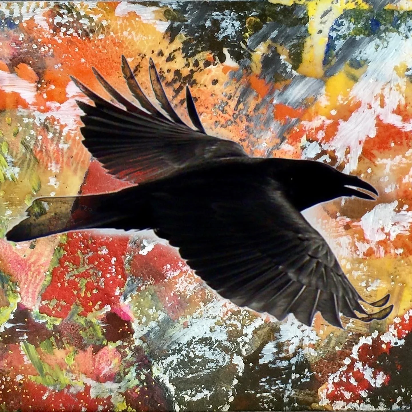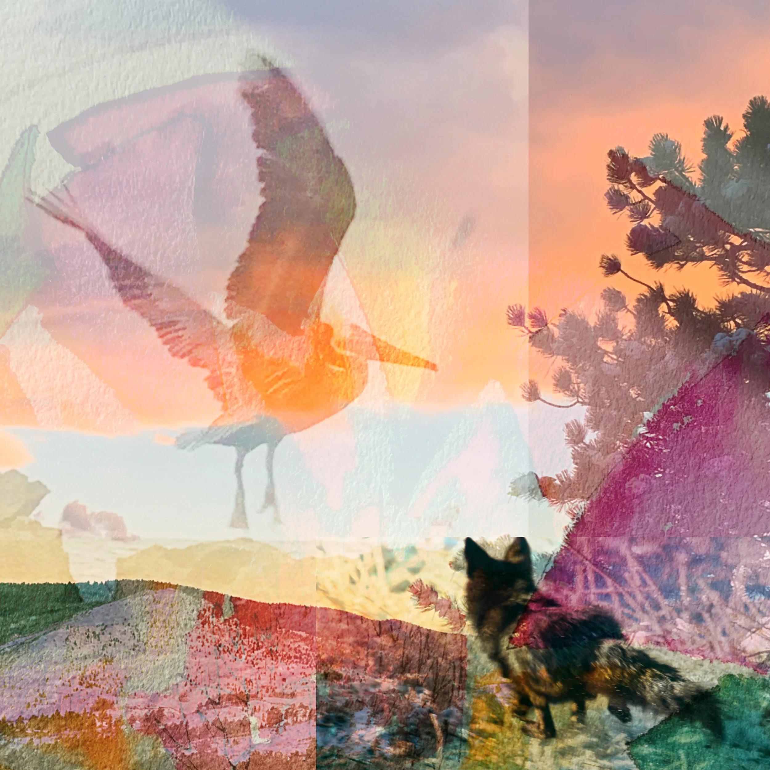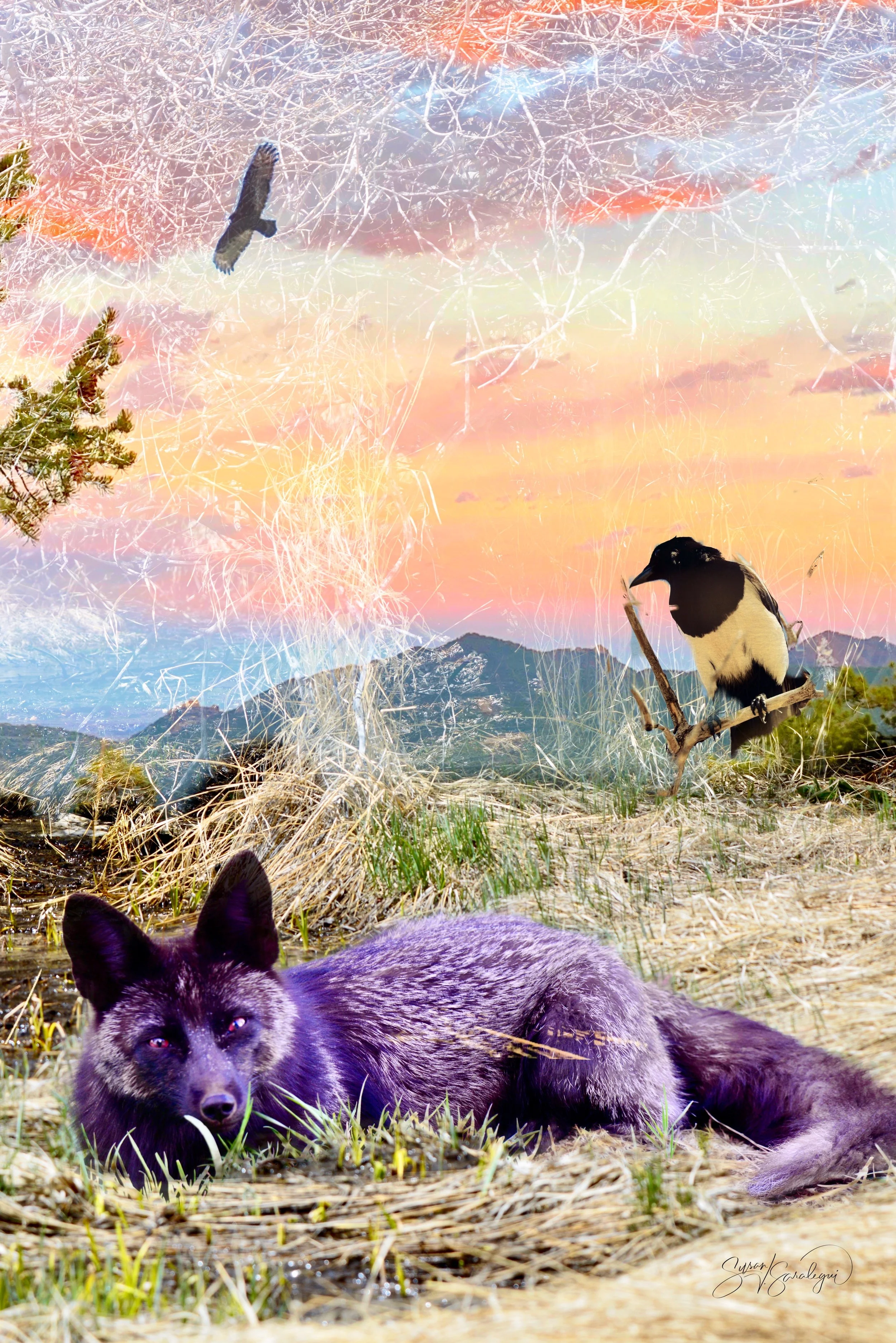 The FoxSpell series was conceived within the Front Range Mountains of Colorado where Violet, a wild black fox with copper eyes, auspiciously appeared to me during a cold, winter sunrise and there remained during a time of emotional turbulence. My estranged mother was suddenly dying, and with that, challenging memories and beliefs confronted me. I was in need of this very companion, a muse, and some intriguing reflection of my soul. During this time, I wrote, drew, painted, collaged, and took endless photographs of Violet, the spectacular land, and all its inhabitants. Her presence comforted and inspired me.